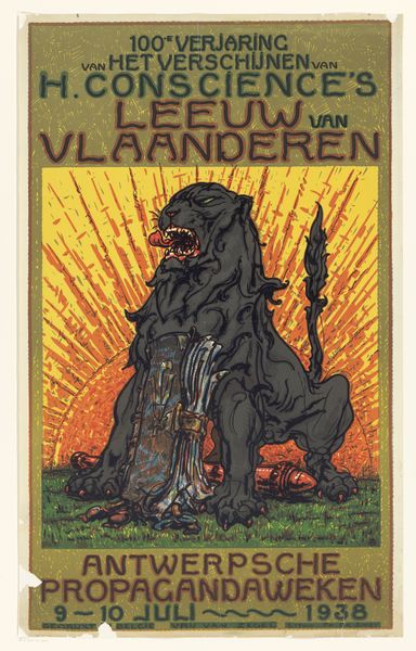 Curator: This is a striking poster by Cassandre, created in 1930 to advertise Vinay chocolate. Editor: The first thing that hits me is how modern it feels, almost cheeky. The simplified shapes and those dramatic diagonals—it’s an unapologetic jolt. The stark contrast creates a very visceral pull to what? Indulge, I guess! Curator: Cassandre was a master of Art Deco and used bold typography and graphic forms to captivate his audience. This particular piece speaks volumes about the industrial advancements in commercial printing and the burgeoning advertising industry that took shape in the interwar years. Editor: I’m hypnotized by that cow. It is howling in white cut against this gradient green backdrop, and seems about to devoured that square block of…what is that, exactly? You can just about read the brand VINAY embossed on each square. The shadow implies depth which makes it jump off the label. It is sort of both elegant and ridiculous. Curator: It’s about creating immediate impact, associating the freshness of milk with a tempting, desirable chocolate product. Editor: Do you think he actually *liked* the chocolate? Curator: Whether he personally liked Vinay chocolate or not is beside the point! As an artist, Cassandre was serving the interests of commercial enterprise, which makes him interesting as a historical mirror of changing times. I would say this shows more than how good a chocolate tastes, I would suggest it reveals the changing tastes of consumers in an emergent industrial economy. Editor: Fair enough, I guess! Still, makes me crave something sweet now… doesn't quite manage to get inside and manipulate your need centers like a true consumer product poster should though. What were we saying before? Ah, that chocolate brands in those days didn't quite master all the manipulative strategies for mass persuasion in consumer products. Maybe there's a metaphor there for society. Curator: Indeed, there's always much more than just what you see on the surface! Editor: It makes me smile. Always a bonus.
