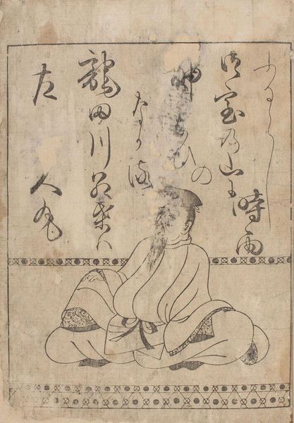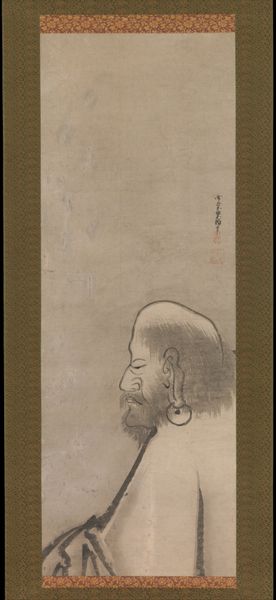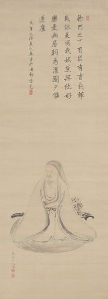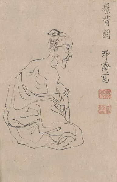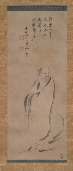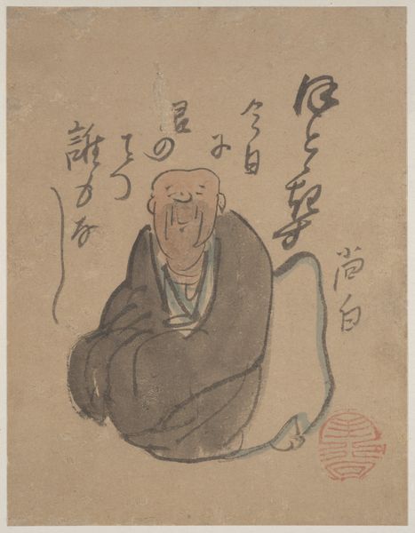 Curator: This is Qi Baishi's "The Buddha," and what strikes me immediately is its directness; it feels like a very personal interpretation. Editor: The texture of the ink wash is intriguing. There's a visible layering, giving weight and form to the robe, almost like woven fabric. What was the process like? Curator: Qi Baishi was deeply invested in traditional Chinese ink painting but broke with convention. This Buddha isn't ethereal or distant; he has a human face, holding a lotus. It challenges the traditional representation. Editor: Absolutely, and I find the way he's grounded, literally seated on the earth rather than floating, emphasizes a connection to labor, to the common person. Curator: That reading resonates. The lotus, of course, symbolizes purity and enlightenment, but the way it’s held, so gently, also suggests a tenderness, an accessibility that disrupts the more rigid, hierarchical readings of Buddhism. Editor: So, in the materiality and composition, we see not just devotion, but also a subtle subversion of expectations. Curator: Precisely, and that opens up conversations about identity and how spirituality is embodied and expressed. Editor: It's a powerful piece, the method amplifying the message.