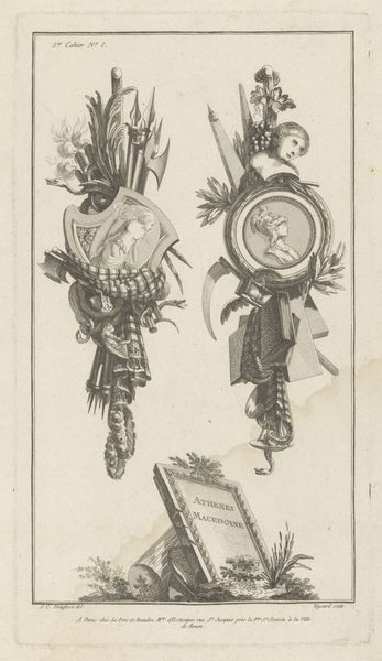 Editor: So, this is "Trofee van smidsgereedschap" created by Michel Liénard in 1866. It's an engraving, a kind of print, I think. I'm really drawn to the intricate linework, how each tool is rendered. But overall, it also feels quite…static. What do you see in this piece? Curator: Intriguing observation. Primarily, I note the arrangement, the strategic stacking of forms. The artist seems preoccupied with the visual balance achieved through the deliberate overlapping and juxtaposition of these varied implements. It is essentially about how forms relate. Do you find that the lines create rhythm or some sort of pattern? Editor: I think so! The lines give everything a certain texture, and they lead your eye around the whole thing, but almost in a closed loop? Curator: Precisely. Consider also the spatial relationships depicted; note the interplay between positive and negative space created by the composition, bounded as it is by the containing arch. Liénard uses the contrasting shapes to articulate a complex and balanced two-dimensional structure, essentially freezing it in time. Editor: So it's less about what the tools are used for, and more about their shapes? It almost makes them seem…abstract? Curator: Precisely. While representing the tangible, the artist simultaneously abstracts these objects. He reduces them to geometric components and arrangements of line, heightening our awareness of pure form. The artist emphasizes a new understanding of utility. Editor: That's a great point. I initially looked for symbolic meaning but seeing it as an exercise in form is eye-opening. Curator: Indeed. It is a work where the intrinsic formal properties generate aesthetic interest. It encourages us to investigate line and shape.