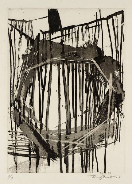 Curator: Looking at "Monument to Man Ray's 'The Enigma of Isidore Ducasse' Philadelphia," a 1996 mixed-media piece by Barbara Chase-Riboud, I’m immediately struck by its almost ethereal quality, despite the weight of the subject matter. Editor: It's intriguing. The lines seem to vibrate, creating this sense of tension. What materials are we looking at here? It looks like pencil and some kind of string or thread. The layering of material is central to it, surely? Curator: It appears to be primarily pencil and mixed media on paper, that capture a form evocative of Man Ray’s wrapped object. Chase-Riboud uses drawing to engage with modernist history, particularly surrealism and the avant-garde's engagement with objecthood. It functions as a tribute and interrogation. Editor: The bindings… they suggest concealment but also constraint. There’s something undeniably visceral about the tightly wound string juxtaposed against the delicacy of the paper. It feels like she’s forcing the viewer to acknowledge the physical reality inherent in the artistic process, the labour it entails. Curator: Exactly. And Chase-Riboud has consistently dealt with monumentality throughout her career, often exploring how public art can confront suppressed histories. In this context, she elevates Man Ray's object to the status of a monument, while at the same time abstracting it, rendering it almost ghostlike. The ghostly impression could represent an elegy and speaks volumes about the legacy and institutionalization of avant-garde ideas. Editor: So, even the act of memorializing—of monumentalizing—is inherently subjective and constructed. The strings could even stand in for museum barriers and display cases. Curator: Precisely! It highlights the inherent tension between honoring artistic genius and grappling with the complexities of artistic influence and artistic agency. Chase-Riboud brilliantly encourages us to reflect on how art institutions mediate our understanding of art history itself. Editor: The materiality definitely enhances this aspect. One is acutely aware that she is memorializing the act of memorializing through her choices of humble mediums. Thank you for your insight. Curator: My pleasure!
