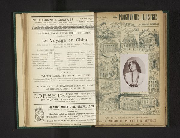 Curator: Here, we see a print titled "Portret van Jeanne Granier als Giroflé in Giroflé-Girofla," created before 1875 by Gaston et Mathieu. What strikes you about its appearance? Editor: The layout is fascinating. It’s like two separate worlds on each page spread of this theater magazine: on the left page there are advertisements, while the right page has the portrait in a decorative frame. What was the purpose of pairing advertisements with portraits like this? Curator: I wonder what the implications were of literally placing advertisements next to the performance itself? This work, created using a printing press, reminds us that the image's value is constructed as much by the process of its production as by the sitter's persona. Think about the labor involved, from the paper production to the typesetting. Who benefits from this image’s construction and dissemination, and how? Editor: So, you're saying that by considering the advertisements next to the image, we're seeing a reflection of 19th century consumption? Curator: Exactly. We can consider who these ads are targeting and what social needs they might be creating. Were these types of publications meant for certain classes, and if so, what type of labor went into creating and consuming it? Editor: So much information to unpack, considering it just appears to be an image of an actress on paper. I’m rethinking how commercial forces and material processes shaped this "art". Curator: It shows how closely intertwined the seemingly disparate worlds of artistic creation and capitalist production truly were.