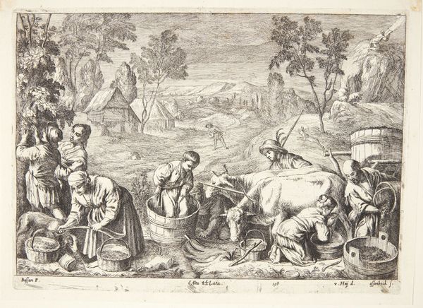 Crispijn de Passe the Elder created this engraving, "Noah leaving the ark with his family and animals," as part of his "Liber Genesis". During the late 16th and early 17th centuries, biblical stories were frequently reimagined through the lens of contemporary social values and artistic conventions. Here, we see the well-known scene of Noah's family and a diverse array of animals disembarking from the ark, signaling the end of the great flood. Yet, looking closer, we might ask ourselves: who are the people carrying the supplies? The women are central to the reproduction of the species, yet burdened to do the labor of re-establishing society. This image invites us to consider the labor and contributions—often overlooked—of women in the narratives of renewal and survival. The birds flying freely and animals descending represent a world restored, but also the start of a new social order. As you reflect on this print, consider the stories we tell and who is included, and who is left out. What do these narratives tell us about the societies that create and perpetuate them?