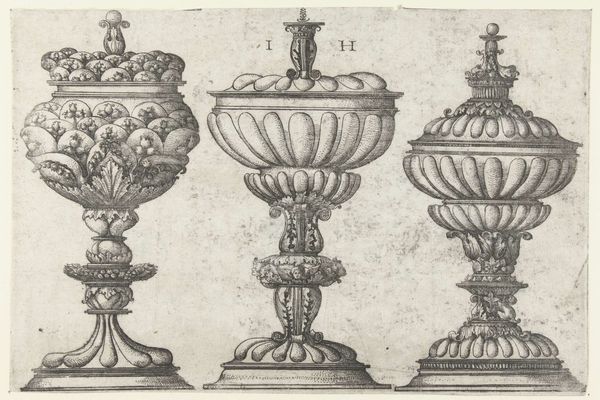 Editor: This is Agostino Veneziano's "Vase with Snake Handles." I'm really drawn to the snakes; they give it such a bizarre, almost menacing quality. What do you see in this piece? Curator: Snakes are incredibly potent symbols. They shed their skin, representing rebirth and transformation. But they're also associated with temptation, danger, and hidden knowledge. The juxtaposition here is fascinating. Do you think the artist intended a positive or negative reading? Editor: That's a great question; I'm not sure. I'm leaning towards danger because they look ready to strike. Curator: It's a duality. This vase could represent both the promise of renewal and the lurking threat of the unknown, reflecting the complexities of the human condition. It's amazing how objects become vessels of deeper meaning. Editor: Absolutely, I didn't realize the depth of imagery one piece of art could have.