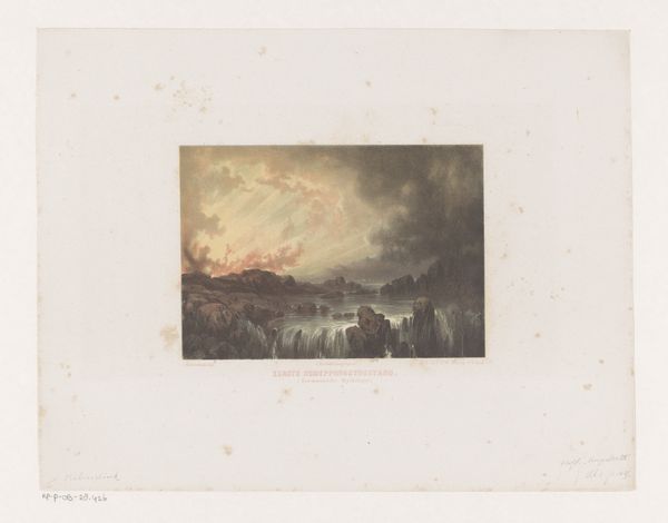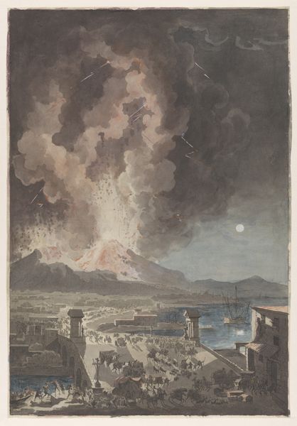 Johann Friedrich Wizani created this image of a 'Volcano Erupting' using etching and possibly other techniques. During Wizani's lifetime, the late 18th and early 19th centuries, volcanoes were potent symbols, embodying both the sublime power of nature and humanity's vulnerability. These concepts were particularly relevant in an era marked by political upheavals, such as the French Revolution, which metaphorically erupted and reshaped societies. Consider how natural disasters and societal changes intersect to reveal deeper truths about power and resilience. The figures observing the eruption remind us of our position as witnesses. The question is, are we merely observers, or are we also implicated in the forces that shape our world? Wizani’s volcano is a powerful reminder of the earth's raw energy and the delicate balance between destruction and creation. This image invites us to reflect on the transient nature of our existence and the enduring power of the natural world.