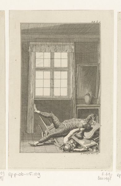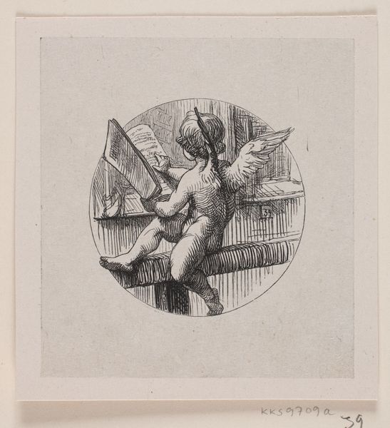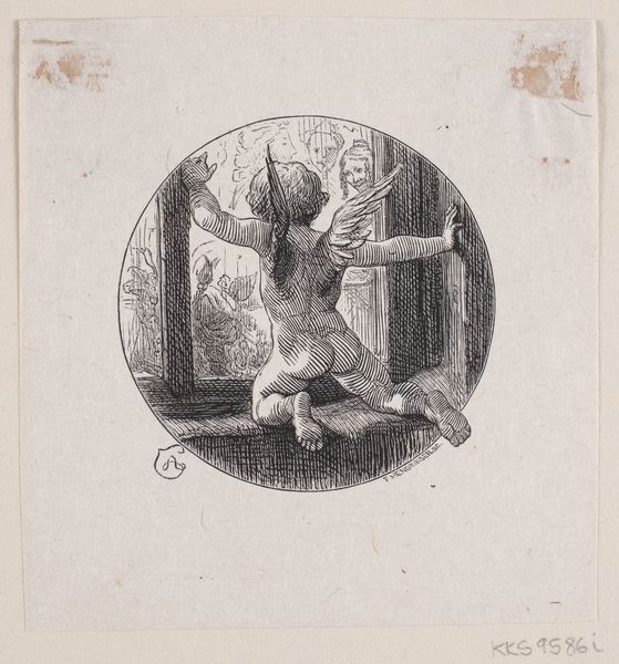 Curator: Here we have F. Hendriksen's "Cirkelrund Vignet med flyvende Engel" from 1876-1877, currently residing here at the SMK. It's an engraving, so a type of printmaking, featuring, as the title suggests, a circular vignette of a flying angel. Editor: My first impression? It's oddly claustrophobic for a scene with a flying figure. The tight circular frame and the densely hatched lines almost suffocate the poor cherub. Curator: That dense linework is characteristic of engraving, where the image is carved into a metal plate, often copper, and then inked. Think about the sheer physical labor involved in creating this intricate network of lines, each one carefully etched. Editor: You're right, there’s definitely an intensity of effort that permeates the image, an intense level of crafting... so all of these lines combine to make a narrative: We have a chubby nude angel rappelling down, not quite flying, from some ambiguous structure— a bit unsettling, perhaps. Is it meant to be allegorical, a fall from grace maybe? Curator: Absolutely, many see it as an allegory, with the nude figure being such an open symbol... or simply a nude. He appears to be escaping something, perhaps earthly temptations, since he's actively distancing himself using the rope as means of conveyance away from what resembles a constructed framework. It could be representing a struggle, using a divine figure struggling toward escape. It certainly contrasts against idealized Renaissance images of angels serenely floating among the clouds. There's some weight to the labor captured in this image as opposed to just divine ascension. Editor: This piece really highlights the often unseen work and materials needed. How many hours would it have taken to cut all those tiny lines? Also consider that metal was at times difficult or costly to obtain so far back; that in itself becomes meaningful beyond a stylistic choice. Curator: Precisely. Its appeal lies, for me at least, in the sense of human touch present in every mark. Editor: I'll admit, focusing on materials gives a new depth; initially claustrophobic, now the image screams human dedication within artistic creation. Curator: Exactly! There's beauty even beyond just pure allegorical messaging—the dedication alone offers us something worthwhile when considered.