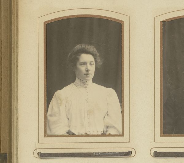 Editor: Here we have Ernest Bichon’s photograph, "Portret van een jonge vrouw," taken sometime between 1860 and 1900. The sepia tone and formal pose give it such a distinct vintage feel. What draws your attention when you look at this portrait? Curator: It's interesting how photography, initially striving for objective realism, so quickly became laden with the symbolic weight of painted portraiture. The young woman's upward gaze – almost pleading – paired with the lace, a traditional signifier of purity and delicacy, constructs a very specific visual language. Editor: Pleading? I hadn’t thought of it that way. Curator: Well, consider how the photographer directs her attention. The subtle upward tilt could imply a deference to a higher power, societal expectations, or perhaps a hopeful yearning for a brighter future. Photography was often employed to elevate its subject, bestowing dignity. Does the lace suggest aspirations or constraints? Editor: I see what you mean about aspiration. The framing of the portrait within the album page almost gives her the appearance of being set apart. The image certainly conveys her character as part of a greater whole of something meaningful and complete. Curator: Indeed. Bichon isn’t just capturing a likeness, but solidifying an image infused with the hopes, anxieties, and values of an entire era. That lace transforms the whole character, doesn't it? It speaks to social identity far more profoundly than just fashion. Editor: It’s amazing how a single image can hold so many layers of meaning. Curator: It is an excellent lesson on cultural memory. These seemingly simple images, they ripple outwards into the cultural psyche.