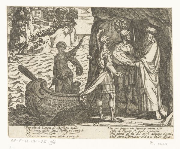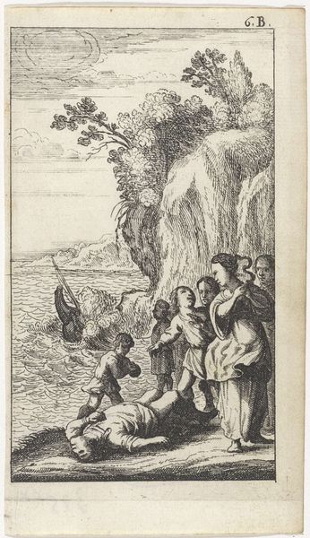 Curator: This etching from between 1632 and 1634, titled "Afstammelingen van Noach vinden de roer uit" by Willem Basse, pulls us into a narrative moment. Editor: My immediate impression is of anxiety. The churning waves, that small boat struggling against the current—there's a sense of desperation. Curator: Precisely. Willem Basse depicts a critical moment from the narrative of Noah's descendants discovering the rudder after the flood, a pivotal element in charting their new world. It's about innovation born of necessity. How might the legacy of that 'necessity' resonate today? Editor: In terms of artistic expression, the etching itself is full of conflict; the tiny figures wrestling for control amid so much chaos echo our own contemporary struggles for stability and direction amid societal flux. Basse almost seems to reflect a gendered struggle; while some are laboring, others stand above, seeming to expect action. The perspective invites a re-thinking of who bears the burden of world-building after devastation, be it natural or systemic. Curator: I'm intrigued by that reading. The landscape's prominence, almost swallowing the figures, also points towards our place within the larger environment—the inherent precarity we face in seeking mastery over forces much greater than ourselves. Think of the rise of merchantilism in this era! The discovery of the rudder has historical as well as aesthetic impact on us as modern consumers of this art. How might the viewer have reacted to the message of this piece in its own time, relative to how we read it in ours? Editor: I see Basse hinting at the socio-political shifts inherent in technological progress; as maritime innovation developed during the early age of exploration, how were these new roles taken up among the population, and did it exacerbate or relieve tension between traditional labor roles and modern enterprise? I imagine a contemporary audience might not pick up on those gendered visual signifiers you detected. Curator: A vital question. The piece makes me reconsider those very forces that still propel human action, technological advancement, and survival to this day. Editor: Agreed, that little boat reminds us of how easily mastery of tools becomes essential to navigating not just the natural world but also social structures and expectations, no matter the cost.