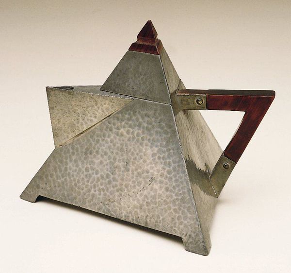 Curator: Hannes Beckmann's "Construction in Sheet Metal," presents an intriguing study of form. Its small size makes it deceptively simple. Editor: It gives me a sense of fragility, like a house of cards moments before collapse. Curator: The stark geometry brings to mind the Bauhaus, where Beckmann taught. It embodies a desire for functional beauty, a new social order through design. How might this aspiration reflect the interwar anxieties of its time? Editor: I'm more interested in how sheet metal, a humble material, is elevated here. The labor involved in shaping it, the industrial process… Curator: Yes, but consider the symbolism! The triangles, stable yet sharp, perhaps representing the tensions between progress and danger. Editor: Perhaps. Or, maybe, it’s a pure celebration of material potential and industrial craft, something to appreciate in its own right. Curator: Ultimately, it reveals the intersection of artistic intention and socio-political context. Editor: And the constant negotiation between material and meaning.
