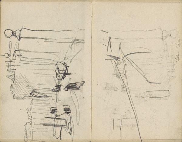 Curator: This is a study sheet with figures and objects by George Hendrik Breitner, dating from around 1907 to 1909. It’s part of the Rijksmuseum’s collection. Editor: It’s almost dreamlike, the way these figures and objects seem to float on the page. There is very little shading, the medium is pencil, and I almost sense that they are in freefall from the lack of firm anchoring. Curator: It’s a preparatory drawing, offering a peek into Breitner’s creative process. The rapid pencil strokes are evidence of the speed with which he must have captured these observations, perhaps on the streets of Amsterdam, or within domestic interiors. Look at how utilitarian they appear in composition with the surrounding empty paper and border. Editor: The human figures are interesting. Are they studies for particular characters or archetypes that Breitner wanted to explore? There's a symbolic weight, particularly in the way they're positioned almost isolated from the mundane objects around them like books, a table and chairs... or are they perhaps deeply interwoven as the cornerstones that bring these physical manifestations to life? Curator: The sketch evokes more questions than answers. Were they commissioned designs? Or purely exercises for his own practice? Consider the role the sketch book plays as a site of experimentation; it's about refining his skill to more clearly delineate from raw material objects the kind of subject that might give definition to his artworks, be they figures or interiors. Editor: Absolutely, I think this artwork reveals something timeless about human life within contained physical borders; books contain knowledge, chairs facilitate meeting, beds allow regeneration… The objects almost amplify the figures’ stories without depicting it. Curator: Agreed. Ultimately, it highlights the means by which Breitner worked, and offers tangible evidence of material conditions under which his creativity came to fruition through use and study. Editor: The way Breitner intertwines the animate and inanimate invites so much pondering on shared meanings…a wonderful testament to memory imbued by symbol.