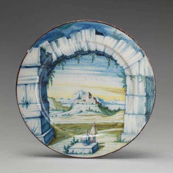Curator: Here we have a tin-glazed earthenware plate, believed to be from De Porceleyne Bijl, a pottery manufactory in Delft. Its creation dates sometime between 1759 and 1793. Editor: My first impression is one of quaintness and chilly simplicity; the blue monochrome rendering imparts a wintry feeling, like a sketch of a long-ago December. Curator: The landscape depicted embodies genre painting traditions, detailing daily life. Note the arrangement of the figures, balanced on either side, a scene of communal winter preparation for gathering fire wood, set against architecture in the distance. Above, you can read “December”, indicating this plate as a piece of a set that maps to the months of the year. Editor: And in thinking of this visual arrangement in historical context, one can speculate on the social implications within this so-called genre scene. Consider that depictions of labor during the rise of industrial capitalism are fraught with ideology, portraying perhaps a mythic, collective identity while often erasing socio-economic divisions. This is a moment when genre painting often overlooked realities by presenting harmonic idealism. Curator: But the rendering, while stylized, delivers some interesting contrasts; the detailed rendering of frozen earth in the foreground gives way to less precise backgrounds—consider also the use of varied cross hatching to define texture throughout the composition. This keeps your eye interested as it moves. The formal organization gives the artwork stability. Editor: Yet the very materials used to create the plate come with a complicated and perhaps dark history. The pursuit of these very raw materials often relied on extraction through exploitative labor systems. What appears idyllic here is situated on real-world inequalities, the erasure of the hands that extracted the resources, processed the material, or toiled over it. Curator: I suppose, by dwelling upon these aspects, you seek to rupture any conventional reading based on sentimentality, or even formal assessment, replacing it with awareness of a brutal foundation—illuminating previously unexamined facets, giving greater perspective on even a simple Delftware plate like this. Editor: Exactly! My aim is that by questioning what is included, we remain inquisitive of what isn’t immediately apparent. By actively acknowledging this, our reading becomes meaningfully grounded within broader social landscapes.