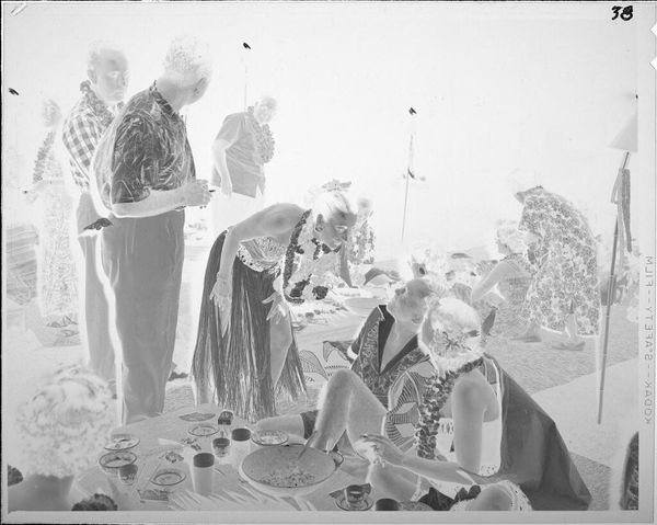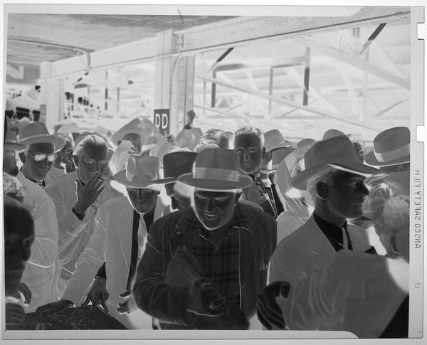Curator: This photographic print by Jack Gould captures a theater audience of uniformed men. I'm immediately struck by the inversion of light—it lends the scene an ethereal, almost ghostly quality. Editor: It's a curious image, isn't it? The men in uniform, presumably part of some naval program, are framed within the larger theater apparatus. It speaks to the institutional labor of image-making in wartime. Curator: Absolutely. And consider the composition—rows upon rows of similar figures, yet each face subtly distinct. The individual lost in the collective experience. Editor: Precisely. The mass production of both men and images, and the interchangeability that implies within these larger systems. How easily are both consumed and disposed of? Curator: You've given me a lot to reflect on; I see this work differently now. Editor: Indeed. Hopefully we all do.