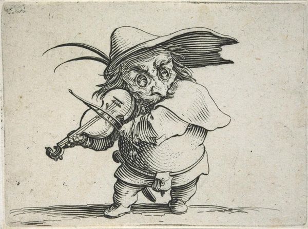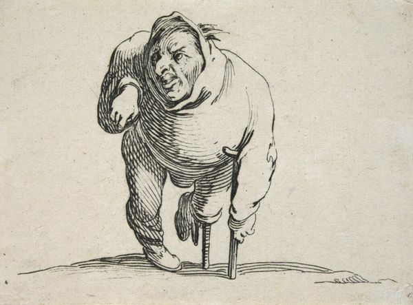 Curator: This etching is by Jacques Callot, born in 1592. It's titled "Masked Man with Twisted Legs." Editor: What strikes me immediately is the figure's unsettling posture – almost as if he's caught between a dance and a stumble. The mask is grotesque, yet there is a strange sort of elegance. Curator: It's part of a series capturing characters from the commedia dell'arte, a form of Italian theater that heavily influenced early modern European performance. Think about the way these stock characters reflected societal norms and anxieties. Editor: Right, and this figure could be interpreted as challenging rigid notions of the body, performance, and identity. Who gets to perform, how, and for whom? There's a playful subversion here. Curator: Callot was deeply engaged with the political realities of his time. His prints circulated widely and influenced how people understood power, class, and the roles we play. Editor: It's a provocative little piece, speaking volumes about the politics of performance and the performance of politics. Curator: Indeed, a fascinating glimpse into the historical roots of identity play.