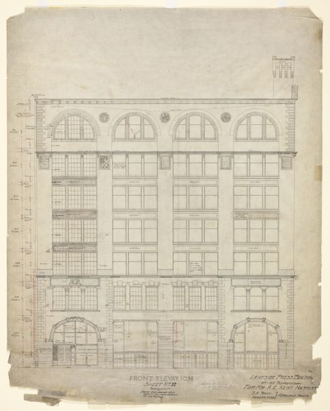 Curator: Looking at this architectural drawing by Adler & Sullivan, I'm struck by its inherent clarity. The stark lines and systematic arrangements almost feel instructional in themselves. Editor: It has an undeniably imposing and almost severe geometry. The rhythmic repetition of those windows is also somewhat unsettling, almost prison-like. Curator: I can see that interpretation. Keep in mind though, this piece entitled "Hebrew Manual Training School, Chicago, Illinois, East Elevation" was rendered between 1889 and 1890. It's crucial to consider the societal context—this was during a time of mass immigration and the rise of vocational education aimed at assimilating newcomers. Schools like these played a very direct role in shaping identities and economic realities. Editor: True, context is everything. But formal features communicate intent too, don't they? Take, for instance, how each window seems meticulously plotted and uniform, yet also framed by the arch which subverts rigidity ever so slightly. What structural purpose does this duality achieve beyond purely aesthetic effect? Curator: Functionally, it would have allowed for light and ventilation to the workshop classrooms, where manual trades were taught. But symbolically, I see it as representing a fusion of old-world heritage – hinted at in the arches - with new-world pragmatism as represented in the overall form and systematized logic. Editor: An intriguing observation. I suppose if we examine those carefully drawn brick details, the overall emphasis of the design reflects late 19th-century America's utilitarian spirit in a world which demanded standardization and practicality in design. The drawing becomes not just the plan for a school, but a statement about American architectural possibility. Curator: I agree, looking at this through a cultural studies lens, its relevance continues to speak volumes about past visions and architectural solutions in communities during this transformative time. Editor: And even on a purely formal level, observing its composition enables deeper aesthetic appreciation. The artwork yields itself slowly layer after layer with prolonged looking.