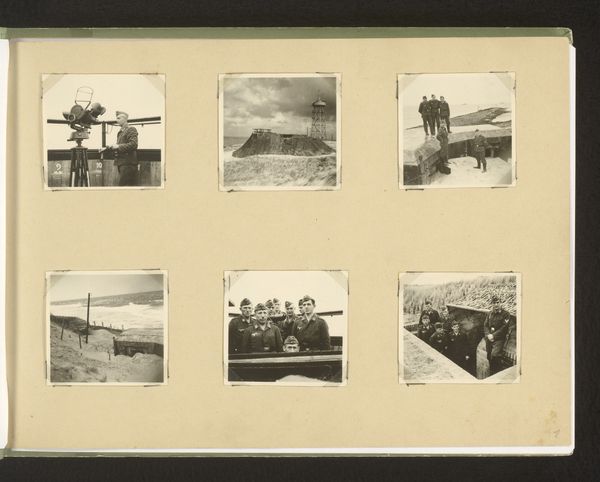 Curator: Here we have a fascinating photographic work titled “Duitse militairen bij een bunker aan de Noordzeekust,” dating from 1940 to 1944. It’s part of the Rijksmuseum collection. Editor: It's a set of gelatin silver prints displayed on the page, it almost appears casual but simultaneously carries such a weight of historical presence, doesn't it? Curator: Precisely. I see a definite emphasis on structure and composition within each framed shot. The arrangement on the page creates an overall visual narrative that demands careful decoding, from left to right. Semiotically, it suggests a careful arrangement reflecting perhaps a visual diary of militaristic life. Editor: Yes, and from a material perspective, the grainy texture of the silver gelatin prints speaks to a specific production method dictated by wartime resource limitations. Each photograph acts as a document showing a form of military labor at the coastal bunker. We glimpse aspects of everyday existence lived against this landscape. Curator: Note how the landscapes create formal, structural tension with the figures. The anonymous artist explores portraiture against the sublime threat of an unwelcoming sea. It reflects German Expressionist motifs, perhaps inadvertently through constraints of resources or instruction. Editor: Interesting point, but I also read how the labor is arranged, not just how the prints relate to German Expressionism, but how each shot documents the work the troops are completing along the coast to further fortify a landscape ripe with extracted natural materials. How was the bunker itself built? The arrangement presents almost a material survey. Curator: A solid argument. Considering it now, it is a powerful synthesis of the aesthetics of landscape and the brute facts of war. Thank you for the insight into these aspects! Editor: And thank you for further analyzing the careful formalism apparent. It definitely made me consider how context meets materiality here, beyond pure militaristic work.