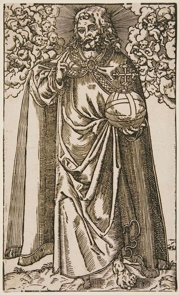 Curator: Lucas Cranach the Elder created this woodcut, "Saint James the Less." It is now part of the collection at the Harvard Art Museums. Editor: The stark black lines against the cream background create such a striking contrast! There's a sense of devout purpose, but also something playfully surreal. Curator: Absolutely. Cranach, working in Wittenberg, was deeply involved in the Reformation, and this piece reflects the era's shifting religious landscape and the role of saints within it. Editor: Notice how the lines vary in thickness, giving depth to the figure. The drapery folds are incredibly detailed, almost sculptural. And what's the meaning behind those two cherubs? Curator: Those cherubs and the setting with a distant city are part of the symbolism associated with Saint James. Cranach was commissioned by wealthy patrons and the church. Editor: Regardless of its purpose, it's a masterclass in the art of the woodcut. The composition, the figure, the landscape—it's all so brilliantly intertwined. Curator: Indeed. It shows how artistic expression can convey complex ideas during times of religious and social change.