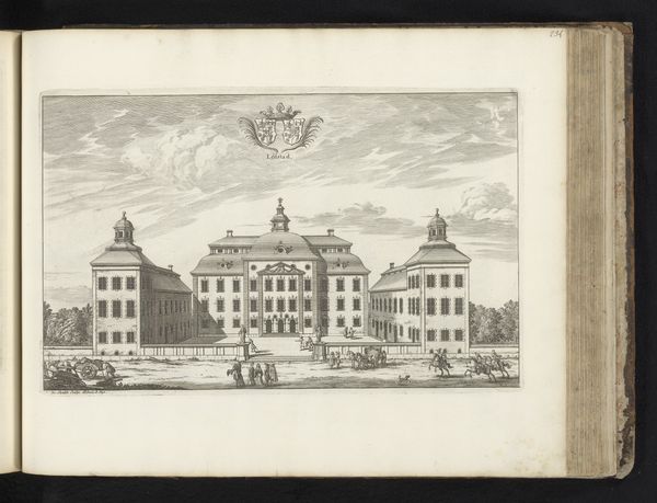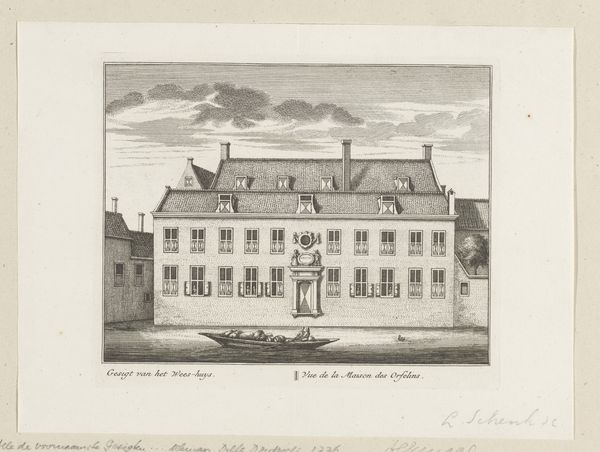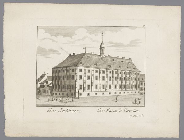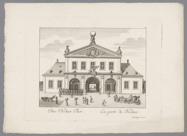 Editor: Here we have "Gezicht op de Spitalkirche, te Mannheim," a cityscape of the Mannheim hospital church, created in 1782 by the brothers Klauber using etching and engraving. The architectural rendering appears very balanced. What catches your eye about its formal qualities? Curator: The Klauber brothers present a study in classical formalism. The engraving is notable for its symmetry; consider how the central axis bisects the composition, anchoring the eye. Notice the repeated use of rectangular forms: windows, walls, the very frame containing the image. How does this rigid geometry affect the viewer? Editor: It feels very orderly, perhaps even a bit sterile. The precision is impressive, but also makes the building seem distant. Curator: Precisely. The success of this piece rests on the masterful employment of line to define space and form. Examine how the gradations in line thickness give depth and volume to the facade, without relying on dramatic chiaroscuro. What do you make of the foreground figures in relation to the overall structure? Editor: The figures are small, seemingly inconsequential. Their placement emphasizes the monumentality of the building, but perhaps also indicates their place in relation to the institution. Curator: Yes, consider the formal relationship – their small size further emphasizes the structured, imposing architecture. It becomes less about the immediate or intimate experience, and more a contemplation of ordered space and form. Editor: I hadn’t considered it that way before. I appreciate the renewed perspective on the balance the artist employed in the details and composition of this work. Curator: Indeed. Reflecting on the artist’s intentional manipulation of these components yields new understanding of the print’s power and precision.