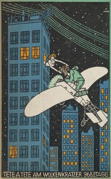 Curator: Welcome. We're standing before Louis Glackens' 1911 watercolor painting, "Set in their Ways." Editor: The immediate impression is whimsical, yet something feels subtly pointed, doesn't it? There's a naive quality to the rendering that draws me in. The light and airy pastel palette creates a dream-like setting, although that distant obelisk introduces a subtle note of grounded realism. Curator: Indeed. Glackens was working at a fascinating point in American history, part of the Ashcan School that sought to depict everyday life. This image specifically targets the upper class of the time, resistant to new "Progressive Policies" - look at the airship floating in the sky, labeled exactly that. You can also note the paper falling out of the lady’s pocket – on which it's easy to read "Reactionary." It's not simply naive art, but a politically charged commentary employing watercolor in a playful way. Editor: True. Visually, that blimp is striking, positioned against those pastel clouds; its horizontality clashes deliberately with the Washington Monument far off in the background, emphasizing an old versus new paradigm, rendered with crisp draughtsmanship. The artist clearly chose his colors to underline the caricatural essence, from the green of the lady's garish dress and bonnet to the purple jacket worn by her male companion. Curator: Exactly. The composition is not merely a picture, but an argument. Glackens' work forces a confrontation between old wealth and the progressive movement. The artist is asking us to consider what will become of their world order. Think of the debates about industrial regulations, worker rights and equality at the time, themes which were being adopted as “progressive policies." Editor: So the humor isn't merely for entertainment, it’s there to provoke critical thought and a deeper reading of the power dynamics being presented. This is accomplished by balancing the bright washes and intricate line work; ultimately the technique brings together the elements into one forceful, graphic statement. Curator: Precisely. Looking closer allows a rich consideration of social forces that shaped the USA a hundred years ago; yet you will find the image also makes one think about society nowadays. Editor: I find myself pondering that dialogue between tradition and progress after our conversation, revealed subtly through brushstrokes, colours, and cleverly designed characters.
