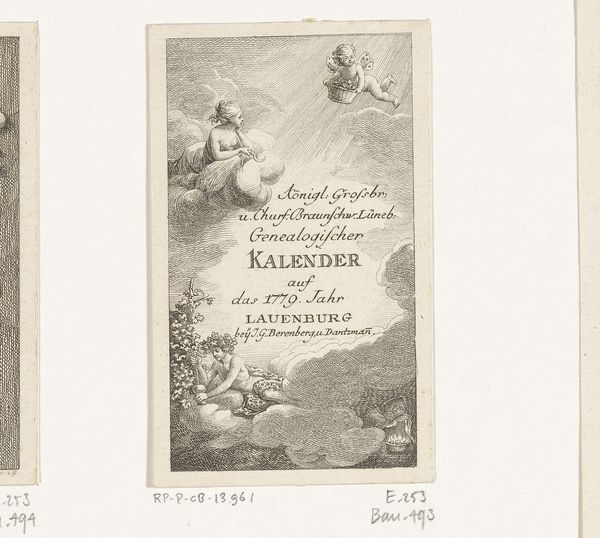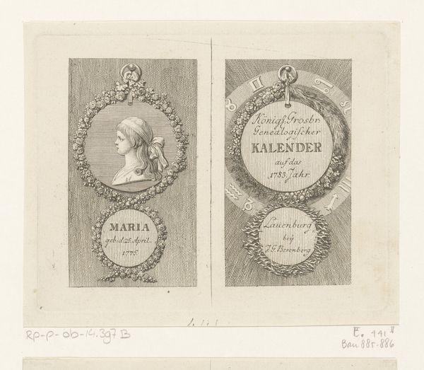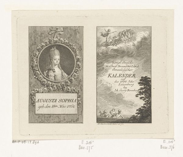 This is a print by Daniel Nikolaus Chodowiecki, made around 1779, combining a portrait of Princess Elisabeth of the United Kingdom with a title page. The composition is neatly divided into two distinct panels, each framed within a rectangle. On the left, we see a profile portrait of Princess Elisabeth, encircled by an ornate garland and ribbon. The delicate lines of the engraving capture the texture of her hair and dress. Adjacent to this, the title page incorporates allegorical figures amongst swirling clouds, creating a sense of depth. Chodowiecki uses contrasting textures and tones to differentiate the subjects, highlighting the interplay between the representational and the symbolic. The structural arrangement of the two panels side by side invites us to consider the relationship between individual identity and broader cultural narratives, all within the context of 18th-century European royalty and the rise of genealogical awareness. This juxtaposition prompts us to question how identity is constructed through both personal image and public record.