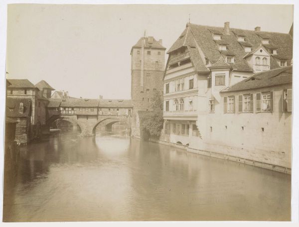 Editor: We're looking at "Kapelbrug over de Reuss in Luzern," a gelatin-silver print from the 1880s or 90s by Giorgio Sommer, currently held at the Rijksmuseum. It's a classic cityscape—almost serene, except for the very sharp geometry of the bridge and tower. What stands out to you about its composition? Curator: Immediately, one observes the rigorous attention to structural balance. The image plane is essentially divided into thirds, horizontally. The weighty mass of the bridge occupies the central band, countered by the negative space of the water in the foreground and the atmospheric gradation above. Consider, too, the vertical thrust of the Wasserturm, offset by the more dispersed forms of the buildings along the left margin. It establishes a clear visual rhythm. Editor: So, it’s almost like a visual equation, each element balancing the others? Does the light play a role in this balance? Curator: Indubitably. The monochromatic rendering enhances the textural differentiation—the smoothness of the water versus the roughhewn stone of the tower. Note how the light catches the surfaces, accentuating the forms' intrinsic materiality. There is a carefully controlled tonal range that emphasizes the geometry and massing. Editor: I see what you mean. Initially, I saw the photograph as simply a nice view, but now I see it’s more about the relationships between these shapes. Curator: Precisely. It’s a study of formal relationships, of how shapes, light, and texture interact within the pictorial frame to construct a compelling visual experience. Editor: That is really insightful. I hadn’t considered it that way before. Thanks for pointing out the underlying structure!
