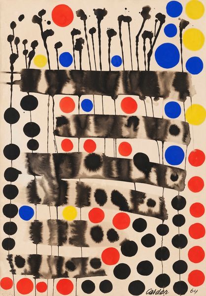 This work, Feuilles mortes, was made by Alexander Calder in 1972, and looks to be gouache on paper. I love the directness of Calder's marks. It’s like he’s letting us in on the secret that art-making is really just a bunch of playful decisions. There's something so joyful in the way he uses color – those bright reds, blues, and yellows, popping against the pale ground. The shapes feel almost like they're dancing, don’t they? Check out the way those black lines squiggle and swirl around the colored shapes. They create movement, like the leaves are falling or floating in the breeze. It’s interesting how Calder balances the flatness of the shapes with the illusion of depth. It's like he's playing with our perception, making us question what we're seeing. This feels connected to the work of Joan Miro, who also had such a playful approach to abstraction and mark making. It reminds us that art is an ongoing conversation, with artists building on each other's ideas and pushing the boundaries of what's possible.
