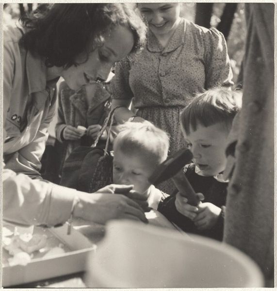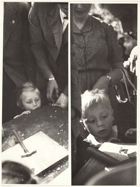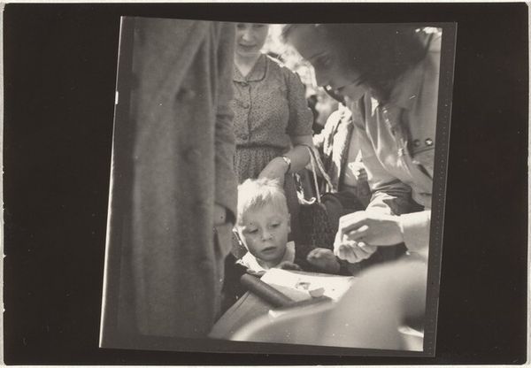 Robert Frank captured this gelatin silver print, *Festival--Children*, sometime in the mid-twentieth century. Frank, a Swiss immigrant, is renowned for his ability to capture the nuances of American life, often with a critical eye. Here, we see two young boys at a festival, engrossed in whatever is in front of them. Two women stand close by, one watches the children, the other helps them. The photo is small, intimate, a fleeting moment captured in monochrome. Frank's work often challenges the idealized images of American culture prevalent in the media of his time. His photographs explore themes of alienation, social class, and the experiences of marginalized communities. Frank once said, "Black and white are the colors of photography. To me they symbolize the alternatives of hope and despair to which mankind is forever subjected." This photograph, with its grainy texture and candid composition, invites us to consider the complexities of childhood and the subtle dynamics of care and community within the seemingly ordinary setting of a local festival.