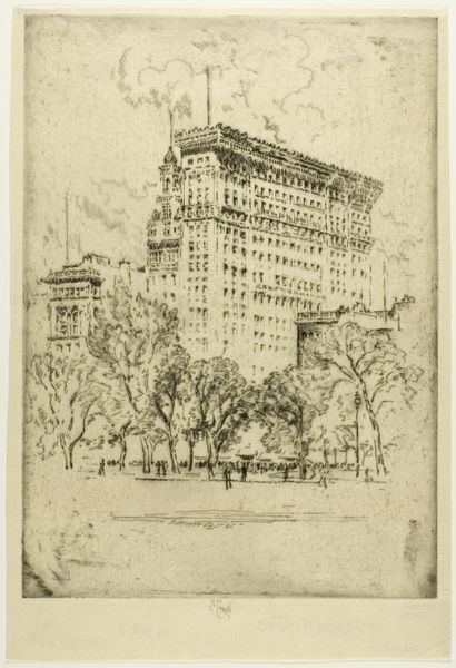 Editor: So, this is Joseph Pennell's lithograph print, "Union Square," created in 1904. It’s surprisingly delicate. I expected a cityscape of that era to feel more…industrial. But this feels almost ghostly, light. What captures your eye? Curator: It does have a lightness, doesn't it? Perhaps Pennell was less interested in celebrating industrial might and more captivated by the ephemeral quality of the city – the way light filters through buildings, the blur of movement. Think about the context: lithography allows for very subtle gradations of tone, creating this hazy atmosphere. Do you feel like you're witnessing a specific moment in time, or more like a memory fading? Editor: I think fading memory for sure. It's soft-focused, like trying to recall a dream. So, in terms of it being impressionistic, it captures that feel more so than the traditional paintings. The bare trees against the towering buildings, the indistinct figures strolling below… it’s all quite evocative, right? Curator: Exactly! The realism is almost secondary. It’s about the feeling of being in Union Square, the sensation of observing urban life, rather than a photographic representation. Do you think that ambiguity adds to or detracts from the historical record? Editor: It makes it feel…universal. Less a specific year, and more like a timeless slice of city life. Something about capturing that moment between fall and spring with the bare trees also gets to me. Curator: And it makes you wonder what stories these hazy figures could tell, doesn't it? That’s the magic of art, prompting endless narratives. And look, there's a charm even in its unfinished quality. Editor: It’s been insightful to explore it beyond the obvious, really teasing out that emotional impression that lingers after you look away. Thanks for pointing it out. Curator: The pleasure was all mine, and thank you. It's the best, no? Looking closer with you makes this old square feel newly alive for me, too.