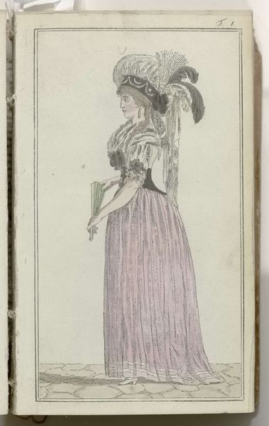 Friedrich Justin Bertuch, in 1790, captured this lady's ensemble in the "Journal des Luxus und der Moden," a chronicle of high society's whims. The most striking element is the feathered hat, its plumes aspiring upwards, echoing earlier headdresses seen adorning goddesses and aristocratic ladies in portraits throughout time. Feathers, across cultures, have represented lightness, aspiration, and a connection to the divine. Note how, even in this fashion plate, the feather evokes a sense of the sublime, subtly elevating the wearer beyond the mundane. Consider how such adornments resurface in various forms—from royal courts to bohemian gatherings—each time imbued with the socio-cultural aspirations of its wearers. The hat does not merely sit atop the head, but rather transforms the wearer into a conduit of collective desires and subconscious longings. It's a continuous dance of cultural memory, echoing through time.