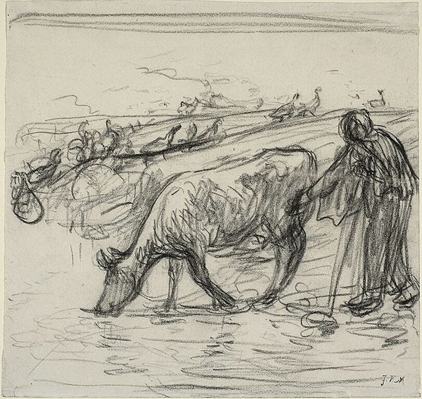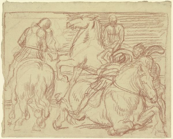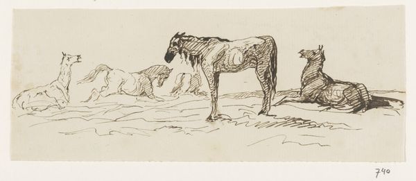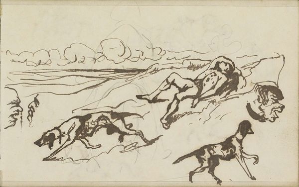 Editor: Here we have "Sketch of Watering Horses" by John Burnet, from around 1847. It's an ink drawing on paper, currently residing here at The Art Institute of Chicago. I'm struck by the immediacy of it. It feels like a fleeting moment captured with remarkable energy, like a page torn right out of the artist’s sketchbook. What pulls you into this piece? Curator: Oh, absolutely, the intimacy of the sketch! It's like catching Burnet in the act of seeing. And it’s more than just horses getting a drink, isn’t it? Look at how he uses that frenetic energy of the ink lines to evoke not just form but also feeling. You can almost *feel* the coolness of the water, the weariness of the horses. It speaks volumes about the symbiotic relationship of man and animal, and all expressed with this flurry of marks. Have you ever noticed how the landscape itself seems to breathe and sway? Editor: Yes! It's almost like the horses are extensions of the land itself. I hadn’t thought of that! But what about the practical aspect? Was this intended as a final piece, or a study for something bigger? Curator: Ah, the eternal question with sketches! Part of their allure is the ambiguity. Perhaps it was simply a visual note, a memory preserved. Or maybe, just maybe, Burnet had grander paintings in mind, and this was him rehearsing before the main performance. We’ll likely never know! Editor: I like that uncertainty, actually. It invites me to create my own narrative around it. It's interesting to see something that wasn’t meant for public display and to make a meaning of it for myself. Curator: Exactly! Sometimes the most profound connections are made with the most unpretentious art. These kinds of unassuming, intimate works help us unlock and remember a specific memory from our past experiences. Like that moment you crossed path with a street artist making similar strokes on his canvas! Editor: Definitely food for thought. Thanks for sharing your perspective! Curator: My pleasure. Remember, the real masterpiece is the one we create within ourselves, by letting the art speak to us.