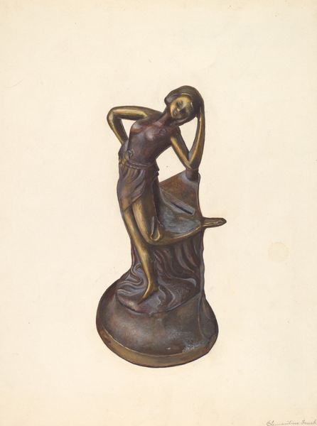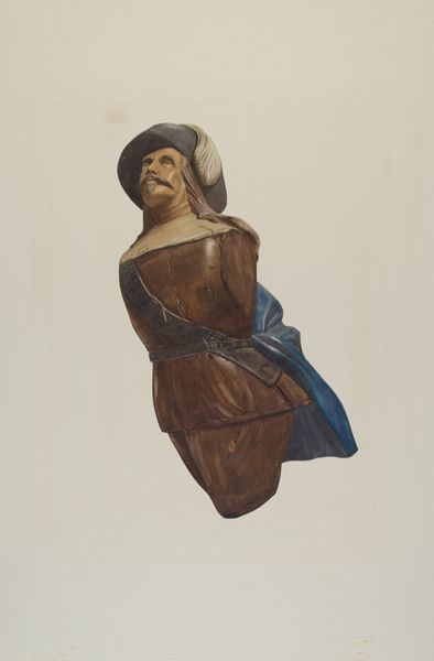 Curator: I find this depiction of physical exertion quite compelling; the piece is called "Gold Beater's Sign" by Elmer G. Anderson, created around 1938. Editor: The realism is striking! The muscle definition is intense, and the arm is realistically weathered. It gives you a clear idea of repetitive motions and great effort. Curator: Anderson was known for depicting industrial labor, and this work encapsulates that interest, it served as the emblem for shops specialized in gold beating during this time. These were highly skilled artisans. Gold beating required immense strength. The sign itself acted as a representation of labor's crucial contribution to economic activities. Editor: Look how the artist highlights form here. Note the tonal modulations. The subdued palette draws focus to textures—the roughness of the hand contrasts against smoother tool. It makes me think about the haptic qualities of work and the labor it requires. Curator: These signs became potent symbols, representative not just of the craft, but of worker's identity and social place within communities. Many labor movements used related imageries around this time. The strong arm, the hammer – the tools of their trade – are their mark of identity, almost an affirmation of who they were and the importance of work that sustained everyone during those times. Editor: Absolutely, but observe how that realism lends it such narrative impact. It transforms simple craftsmanship to epic endeavor. The figure fills space – visually communicating significance way past literal. This sign, made from watercolors and charcoal, celebrates labor through powerful representation. Curator: It is so powerful how Anderson could celebrate something as everyday as physical work. Its legacy calls to attention an evolving and rich social history. Editor: It does – the artwork turns mere labor to art, elevating work through the artist’s keen understanding and sensitive depiction. It encourages a profound view of those frequently left unregarded.