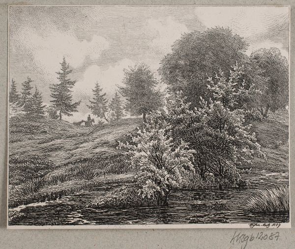 This landscape etching was made by Vilhelm Kyhn. The image is achieved through meticulously incised lines in a metal plate. The quality of the etching, its very precise lines, create a wealth of detail despite the print’s small size. The etched line defines the forms, modeling the scene of the landscape. Note the variety of marks used: hatching, cross-hatching and stippling. See how these different methods are used to create tone and texture, capturing the nuances of light and shadow. This level of detailing suggests skill and labor. Printmaking processes have historically been closely tied to wider social and economic structures. While fine art, they also have a role in the production of popular imagery, playing a key role in disseminating information and cultural values. By considering the materials and processes behind this print, we gain a deeper appreciation for its cultural significance. It challenges traditional distinctions between fine art and craft, and invites us to consider the intersection of art, labor, and social context.