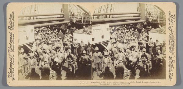 Editor: This gelatin silver print from 1900, "De Lancashire Fusileers op de Roslin Castle onderweg naar Natal, Zuid-Afrika," captures a regiment of soldiers. It’s almost overwhelming to see them all crammed together like that. What story do you think this photograph is trying to tell? Curator: Oh, it whispers of so many things! Can’t you just smell the salty air and feel the nervous anticipation? This image, a frozen moment before these men embark for the Second Boer War, isn't just about military might; it’s about individual stories lost in a sea of khaki. Think of their fears, their families, what awaits them. That ship, the Roslin Castle, isn't merely transportation – it’s a vessel carrying hopes, anxieties, and the weight of empire itself. Editor: Empire, right. It's easy to get lost in the individual faces and forget the bigger picture. It makes me think about propaganda too... a curated image of strength? Curator: Precisely! Do you see how meticulously arranged they are? The photographer, whose name we don’t even know, carefully constructs a sense of order, of unwavering resolve. Is it truth? Perhaps a partial truth. It reminds me of faded glory and faded hopes – history often blurs the line between them. It gives me a peculiar sensation to reflect on the world in this time compared to ours, doesn't it? Editor: I see what you mean. It’s definitely made me think differently about war photography in general, actually. Curator: Indeed. Next time, maybe we look deeper into who profits when those trigger-fingers develop photographs?