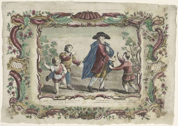 Editor: Here we have Giovanni Volpato's "The Forgiveness of Sins," an 18th-century print using etching and aquatint. I’m struck by the intense Baroque frame around the figures; it almost feels like the forgiveness is happening inside a jewel box. What significance do you see in this imagery? Curator: That “jewel box” is important. Notice how it contrasts with the figures and landscape contained inside. I see a deliberate attempt to domesticate something potentially unruly: forgiveness, especially after violence implied by the discarded weapons on the ground. How is this image working to maintain social order through idealized acts of absolution? Editor: I didn’t think about that—that violence had already happened, even though what's depicted is a reconciliation! Curator: Precisely. The embrace becomes less about genuine emotion and more about performing a societal expectation. Consider how the ornate border further emphasizes the privileged nature of this interaction. Who benefits from such "forgiveness"? Is it about healing the wronged, or preserving the status quo? Editor: That's a very cynical take, I like it! So, the embracing figures, they're not just forgiving; they're upholding power structures? Curator: Exactly. Think about the period. Eighteenth-century social structures were incredibly rigid. Prints like this would have circulated among a specific class, reinforcing ideals of reconciliation while masking the underlying inequalities of the time. It’s less about genuine remorse, and more about maintaining decorum within a potentially volatile social climate. Editor: So, by understanding its history, the "jewel box" becomes less beautiful and more of a gilded cage. It definitely reframes how I initially viewed it! Curator: Indeed. Now consider who is absent from this act of forgiveness and what it all costs for those who are truly marginalized. It may have larger repercussions than a simple moral transaction.