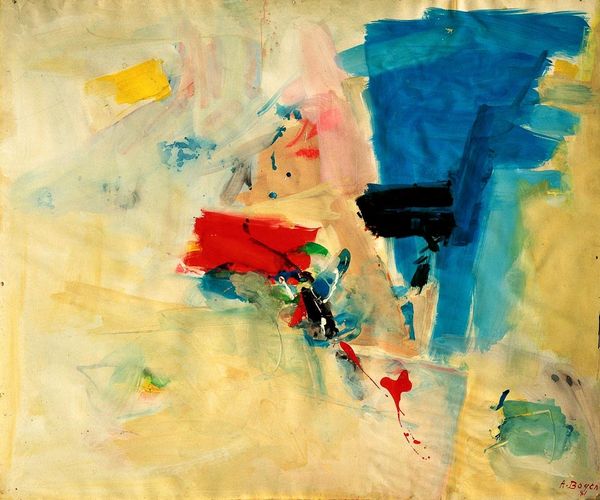 Editor: So, here we have Sam Francis's "Toward Disappearance III" from 1958, made with acrylic paint. I’m really drawn to the sense of spaciousness and, honestly, a kind of tentative quality. The colours cluster on one side and then…nothing. What strikes you most about it? Curator: Tentative is an interesting word. It reminds me of a haiku, the way it suggests so much with such sparse gestures. It's like Francis is whispering secrets about form and void, isn’t it? About what exists, and what’s…evaporating. Do you see the dance between the positive shapes and all that negative space? Editor: I do! It’s like he’s sculpted air as much as painted the…blobs? Is it about the fleeting nature of experience? Curator: Perhaps! I've always felt it hints at Eastern philosophies. The “disappearance” isn't necessarily a sad thing; maybe it’s about the ephemeral quality of everything. The idea that holding on too tightly just...smudges things. What if it's about finding beauty in the momentary? Editor: Oh, wow, I didn’t think about it that way. So it’s not necessarily dissolving into nothing, but maybe… transforming? Curator: Exactly! Francis himself had a lifelong fascination with light, with the idea of the canvas breathing. Notice how the drips almost look accidental but carry their own intentional weight. And ask yourself what becomes visible as something disappears? Editor: This painting's much more hopeful than I initially thought. Now I want to chase my own disappearances and find out. Curator: Excellent! It is more about discovering than seeing! I guess that’s something that both connects and defines us.
