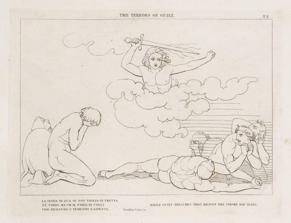 Curator: This is "The Fiery Serpents" by John Flaxman. Though undated, Flaxman was active in the late 18th and early 19th centuries. Editor: The stark lines against the white background create an immediate sense of dread, almost clinical in its depiction of suffering. Curator: Flaxman was deeply engaged with classical literature. Note how the serpent, a common symbol of chaos, is here used to represent divine punishment, likely drawing from biblical narratives. How does this reinforce existing power dynamics? Editor: Absolutely. The serpent’s form itself—its coils, its eyes—evokes primal fears, representing not only punishment, but also temptation and loss of innocence. A potent symbol across cultures. Curator: By referencing ancient imagery, Flaxman speaks to the timeless nature of oppression and resistance. The figures, though biblical, resonate with contemporary struggles against authority. Editor: It is a powerful reminder of how visual symbols transcend time, carrying layers of meaning that reflect our collective anxieties and hopes. Curator: It invites us to consider the serpent's evolving cultural significance. Editor: Indeed, from ancient myth to contemporary discourse, it continues to slither through our imaginations.