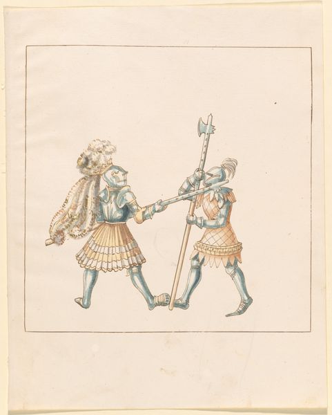 Editor: Here we have "Foot Combat with Flails," dating from around 1512-1515, an anonymous watercolor drawing. It feels quite delicate for such a brutal subject; the pale washes give the figures a certain distance. What do you make of its aesthetic choices? Curator: It is the constrained palette that immediately captures my attention. Note the artist’s deliberate use of colour; primarily blues, yellows and greys. These aren't naturalistic hues, of course, but carefully chosen tones that, together, articulate form and texture. Consider also how the sharp outlines delineate the figures. This stylistic treatment contributes to its impact. The artist isn’t necessarily concerned with capturing the real space so much as capturing an essence, an idea of combat. Editor: It’s true, the emphasis is not on realism, but the decorative quality of the figures, particularly the figure on the left. He's wearing such a beautifully pleated skirt and the feathered adornment! Curator: Observe the artist’s application of watercolor in thin washes, with the underdrawing visible. Are they interested in depth, volume or a more linear treatment? Note how this emphasis flat areas focuses on surface design and silhouette. It minimizes naturalistic shading and directs our eye towards linear rhythm. Editor: So, the drawing isn't just documenting a fight, but is also really investigating form, texture and colour through these two stylized figures. I hadn't considered the deliberate composition until now! Curator: Exactly! It serves as an aesthetic experiment of sorts. By examining these elements independently of narrative function, the artist urges us to reflect upon their role in our overall aesthetic experience. Editor: That really changes how I see the image, from a historical depiction to a formal exercise. Curator: And through understanding the way forms work together to make the whole we appreciate more of this art!