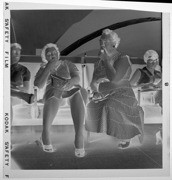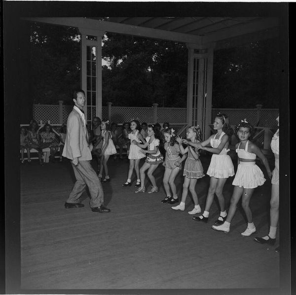 Curator: This photograph by Jack Gould captures children, seemingly girls, in costumes auditioning for theater, perhaps dancing. It’s a gelatin silver print. Editor: The composition strikes me; the girls stretch across the frame, their linked hands create a powerful horizontal line, bisecting the space, almost a frieze. Curator: The costumes are revealing of their time, yet evoke timeless themes of performance and youthful aspirations, mirroring archetypes of innocence and display. Editor: The stark contrast between the foreground and background lends a theatrical air, spotlighting the performers while obscuring the audience. Curator: Indeed, the play of light and shadow creates a palpable tension, a sense of anticipation permeating the entire image. Editor: Looking at the symbolism, I see the universal desire to perform, to be seen, echoed in the vulnerability and nascent confidence of the girls themselves. Curator: Yes, it is almost a study of the balance between individual expression and the imposed structure of performance. Editor: A fascinating glimpse into the intersection of dreams, childhood, and the theater’s enduring power.