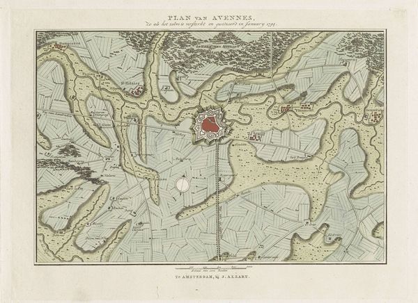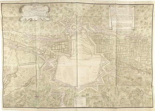 Curator: Let's turn our attention to this fascinating piece, “Plattegrond van Tongeren,” or “Map of Tongeren,” dating from around 1701 to 1715. It's an ink drawing on paper by Samuel Du Ry de Champdoré, rendered in that confident Baroque style. What are your initial impressions? Editor: Immediately, I'm struck by how it's less a map and more a symbol. Look at the formal layout, that walled city almost levitating on the page, surrounded by… is that farmland? It's so meticulously ordered, yet it hints at the anxieties of the time, this obsession with defense, enclosure. Curator: Precisely. It reflects the Baroque period’s emphasis on order and control, almost as if to tame nature, or maybe control people? The cityscape motif is dominant here. These geometric patterns aren’t accidental, you know. Editor: I think it shows not just defense but aspiration. That rigid geometrical grid, imposed upon the landscape… It speaks to power. A planned civilization is quite symbolic. What about that blank space within the walls though? It almost mocks the very ambition you just mentioned. Curator: I perceive it differently, I read it more like possibility, an emptiness waiting to be filled with…well, more power. Baroque art often served as propaganda; images like this would solidify ideas of urban pride and sovereign authority. See those delicate inky lines and that controlled geometry. Those lines say it all. Editor: Maybe... or it hints at the precariousness of that control. The dark ink, stark against the parchment, conveys permanence but then I look closely and see all this open area is just...nothing! It looks like something still not done or never finished and you want me to feel this certainty about civilization, power, planning... when I look I see something failed in reality! Curator: You've presented me with an entirely novel lens; I'm quite thrilled about that! These renderings are always interesting because there is an attempt to display that the place it is displaying, *IS* an organized plan, as you look and analyze that reality through time and imagery! It's fascinating. Editor: Precisely! The symbols endure. We still plan. We still hope for order, even though real life laughs in the face of geometry!