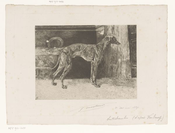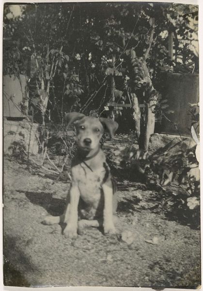 Curator: Standing proudly before us, we have "Dog Before a Manor House, possibly Groot Warnsborn near Arnhem" by Johanna Margaretha Piek, likely captured between 1889 and 1893 using the gelatin-silver process. Editor: My first impression is serenity tinged with solitude. The gentle sepia tones lend an antique aura, and the dog... he’s the sole focus, an island in a sea of architectural geometry. Curator: Indeed, the photograph invites a close look at the structural elements. Note the strict vertical lines of the window and pillars juxtaposed with the dog’s fluid, almost classical, stance. The contrast is quite striking. Editor: He almost appears like a mythological figure guarding a portal, but it’s bittersweet too, don't you think? Like he's waiting…for what exactly? Someone to throw a ball, the master of the house? Or simply fading away into the mansion’s shadow. I almost want to befriend this noble guy! Curator: I see your point. Perhaps Piek is commenting on the rigid societal structures, representing it through the house. Then the dog could be seen as loyalty tested against those formal restrictions. Or she is perhaps investigating ideas about home, nature, and identity in this era when social conventions were being challenged by modernising Dutch society. Editor: I'm also struck by the sepia itself, not simply for its aged aesthetic, but how it seems to strip away all color, laying bare only forms and shadows. The photograph takes on a melancholic, dream-like dimension because of it. Curator: Exactly. The composition forces you to see beyond the obvious, turning a seemingly simple image into a thoughtful meditation on our relationship to space, history, and even companionship. Editor: Well, now I'm viewing it as less melancholic, and more enduring. This dog in this place might live beyond me. A canine spirit immortalized in a moment, outliving bricks, mortar and the shadows of an imposing estate. A little bit magic!