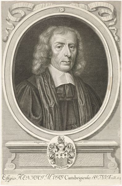 Curator: This is a print titled "Portret van Johannes Hevelius," created sometime between 1643 and 1691 by Lambert Visscher. It’s a Baroque-style portrait executed as an engraving. Editor: It's striking, the textures the engraver manages to achieve! The curtain behind the subject seems to have an ethereal silkiness, while the subject’s robes and hair are richly detailed. What can you tell us about the materials and process? Curator: Well, engraving, of course, is an intaglio process. Visscher would have used a burin to cut lines into a metal plate, likely copper. Ink is then forced into these grooves, and the surface wiped clean. The pressure of the printing press transfers the ink from the plate to the paper, creating the image. Notice how the density of lines creates areas of light and shadow to model the form. Editor: It makes you consider the hand of the artist so directly. Every single line is a deliberate mark, a conscious act of labor to translate likeness and even, dare I say, something of Hevelius' character, into ink on paper. And given that this is a portrait, I wonder how much this affects the availability of images in that time? What social role does a portrait play and for what audience would they have been made? Curator: The portrait is certainly idealized. The oval format and elaborate border lend an air of classical elegance and importance. Hevelius’ gaze is direct, yet refined. Note, too, the compositional choices—the dark background pushes him forward. Semiotically, the drapery connotes wealth and status, and the light falling on his face illuminates intelligence and insight. Editor: Yet it is these signs of wealth and power that come across almost theatrically. From the heavy curtain in the back to the almost cartoonish proportions of the leafy decorative wreath, everything seems so clearly geared towards creating a social standing through these deliberately crafted printed portraits. In what ways does such a deliberate crafting influence and impact the portrait as an accessible and reproducible product? Curator: Absolutely. And beyond its status as an image, consider the print itself as a precious commodity circulated among collectors and patrons, creating and reaffirming social networks. A fascinating convergence of artistry, craft, and socio-economic forces. Editor: Yes, reflecting on this now I really notice that. What begins as a single printed portrait, expands so dynamically outward in terms of the labour that makes it. Thanks for opening up new layers for me today!
