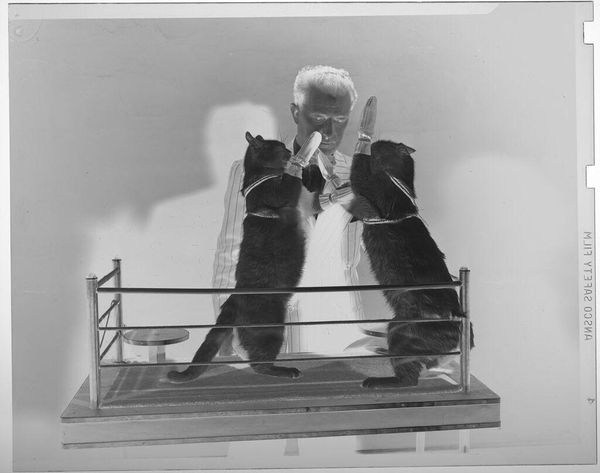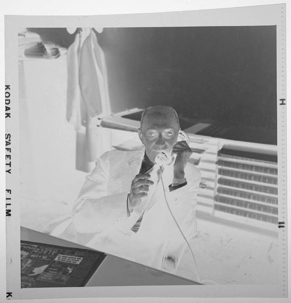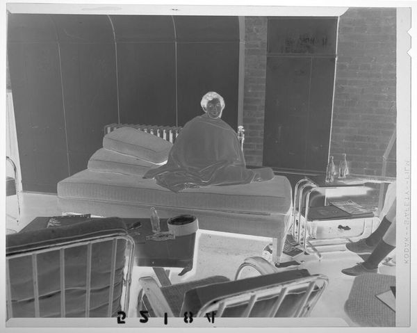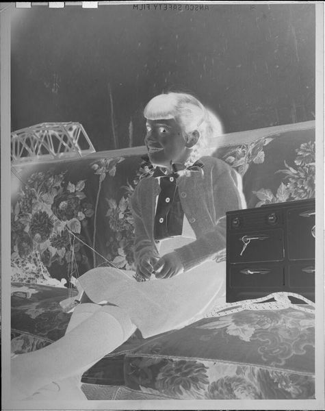 Curator: Let’s consider this intriguing work by Lucian and Mary Brown, titled "Untitled (boy in bed with toy gun)," a small, gelatin silver print currently held in the Harvard Art Museums. Editor: It’s striking how the inverted tones create such a stark, almost unsettling mood. The toy gun glints menacingly. Curator: The unsettling feeling is valid; consider the power dynamics at play, the intersection of childhood innocence and the premature introduction of violence, a theme deeply embedded within our societal constructs. Editor: And the photographic process itself, the darkroom manipulation, the chemical reactions—they physically manifest this disquiet. It’s not just the image; it’s about how it’s made. Curator: Precisely, it provokes conversations about performativity and power structures, especially concerning young boys and their implied roles. Editor: Indeed. The materiality of the image and the imagery coalesce to question societal norms. It's a potent reminder of the objects we create and consume and the social impact that they have.
