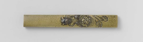 Curator: Here we have an intriguing sword knife hilt adorned with a depiction of a warrior wielding a bow. We estimate its creation between 1750 and 1850, rooted within Asian artistic traditions, showing use of metal and carving techniques. Editor: The first thing that strikes me is how the dark metal of the hilt contrasts so sharply with the gilded figure. The entire composition is quite compact, like a compressed epic. Curator: It's compelling, isn't it? The choice of subject matter--a warrior, his bow drawn--tells us a lot about the potential cultural narratives circulating during that period. War and militarization were often romanticized. What is perhaps absent from these martial depictions, and others of the period, are images of the common soldiers forced to engage in war. Editor: Exactly. And to take that a little further, who created the piece, and for whom? Was this perhaps intended for an elite clientele who might see their own power reflected back at them in miniature? Was it perhaps worn, brandished even? A tiny golden god of war hanging at their hip? What story was it intended to tell through this little object? Curator: Indeed. And while we can analyze the historical implications, let's not overlook the material artistry. The fine metalwork carving, bringing forth a scene of a poised warrior. You get a sense of the weight of tradition and power being evoked through a handheld object. Editor: It certainly captures a particular kind of masculine ideal that would be fascinating to unpack, given the potential historical moment it emerged from. I keep thinking about how it could act as a key to a broader conversation about martial arts, class structures, and visual rhetoric within society at the time. Curator: It brings up complex dialogues that the art provokes. Editor: Yes, exactly, its small scale shouldn’t deceive us from understanding a small symbol can bear enormous cultural significance. It has a lot to teach us about who we were, or who we strived to be, and maybe what that might tell us about ourselves today.