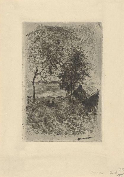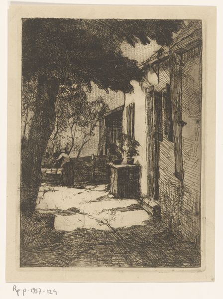Editor: Here we have "Garden by Half-Timbered House" etched by Simon Moulijn in 1919. It's a quiet scene, almost melancholic. All those finely etched lines give the print a wonderful texture. How do you interpret this work? Curator: It’s fascinating to consider this image through a lens that questions what "garden" means here. It isn't just nature; it's nature domesticated, existing in relation to this "half-timbered house." What does this pairing evoke for you? The controlled versus the wild? The owned versus the free? How does the very technique, etching, a process of controlled removal, speak to this tension? Editor: That’s a great point. I hadn't thought of the etching process itself reflecting control. It does feel very deliberate. So, are you saying the "garden" here becomes less about the plants themselves and more about what their arrangement, or the artist's representation of them, says about power dynamics? Curator: Exactly. Think about who has access to such a space. In 1919, a year after the end of World War I, this image whispers of longing for peace, stability, and perhaps even a yearning for an idealized past tied to the land. Whose idealized past is being centered and at whose expense? Does this scene present an exclusionary image of serene domesticity, inaccessible to many due to societal and economic inequalities? Editor: I see what you mean. It’s no longer just a pretty garden, but loaded with social context. I hadn't initially considered its post-war creation. Curator: Consider also, who had the privilege and time to create such work after such devastation. Editor: This makes me think about the choices we make when representing history, what we include and exclude, and how those choices shape our understanding of the past. Curator: Precisely. Hopefully this allows the viewer to begin to think critically not only about art, but society, too.