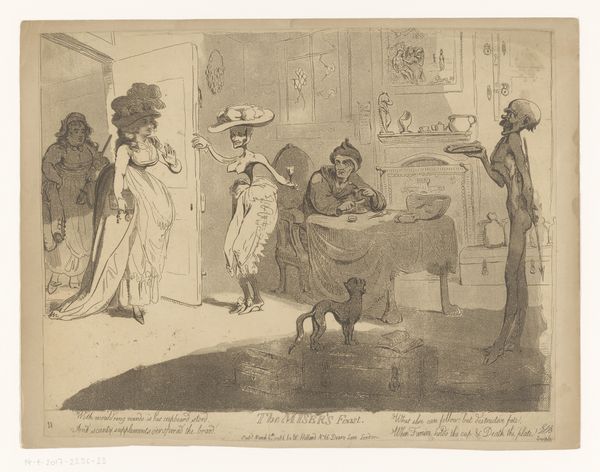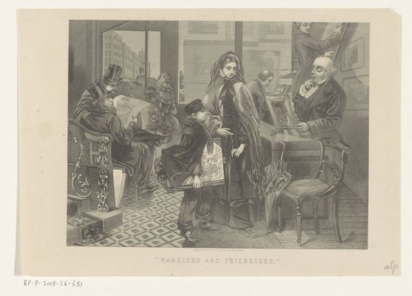 Editor: This is Emily Mary Osborn's "Nameless and Friendless" from 1862, published in the Illustrated London News. It's a print depicting a woman seemingly out of place in an art gallery. There’s such a somber, almost melancholic mood. What strikes you about it? Curator: The power of images lies often in their symbolism, their cultural echoes. Notice how Osborn, as a woman artist herself, uses this woman's isolation as a potent symbol. What do you see in the surrounding figures' gazes? Editor: Well, most seem indifferent or perhaps even critical. The older man, especially, seems to be appraising her work, or maybe her as well? Curator: Precisely. And that is where the cultural memory is activated. The male gaze was a dominant force in the art world. Osborn uses this to represent the barriers facing women artists. The veil, typically associated with mourning, here conceals her, offering a degree of protection, yet simultaneously marking her as ‘other’. It speaks volumes. Editor: So, the veil isn't just about mourning a person, but maybe also the mourning of opportunity or acceptance? Curator: Exactly! Consider too, how the composition mirrors this. She is literally framed by the men assessing art. Osborn subtly invites us to reflect on whose stories are told, and whose are erased. Editor: It's like she's embedding a social commentary within the image itself, a really powerful way to communicate a feeling through symbols. Curator: Indeed. Understanding those symbols unlocks so much of the meaning embedded in the visual narrative. It really invites the viewer to reconsider whose perspectives dominate the cultural landscape, even today. Editor: I see the image in a whole new way now.
