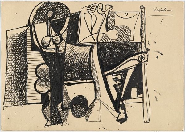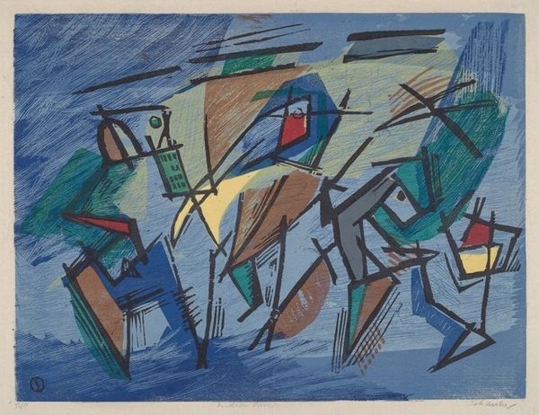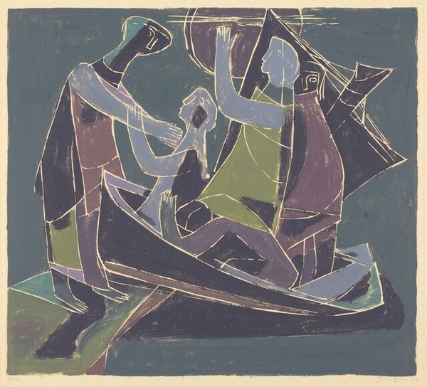 Curator: Looking at Louis Schanker’s “Wall Handball,” a 1942 woodcut, what captures your attention first? Editor: The angularity, definitely. And the green—it's almost aggressively present, like a stark stage for these abstracted figures. It feels both energetic and unsettling, if that makes sense. Curator: It does. Schanker was working during a time of enormous upheaval; the Second World War had a profound impact. Considering his turn toward abstraction, especially compared to earlier social realist pieces, can we see this fragmentation as reflective of societal anxieties and changing social structures? Editor: Absolutely. Handball, at its heart, is about confined energy and controlled violence, mirroring the tensions of wartime. Look at the abstracted players: fragmented limbs, reduced to geometric forms. It's as if their very bodies are being broken down, atomized by conflict, which has emotional links with similar work by people like Grosz. Curator: And yet, even with the fractured forms and dissonant angles, there is movement, an implied trajectory, a dotted line indicating a ball in motion. Do you see symbolic meaning in this juxtaposition? Editor: Certainly. The fragmented body is a recurring motif representing not just loss but resilience. It is also possible this “ball” is intended to show the cyclical violence experienced across this era of repeated war, like an echo bouncing back at those who deal it. Perhaps a cultural call for peace rather than “playing along”? Curator: It's also worth noting the material. As a printmaker, Schanker engaged with a medium readily accessible and reproducible, inherently democratic. He also would have had greater public access. Editor: Good point. This makes the symbolism of war and body more publicly open, with more view to its themes being understood across social boundaries. It is much more politically penetrating and subversive if its social critique could be shared openly and freely with others. Curator: It does prompt us to question how historical context, cultural memory, and even a simple game can intertwine to shape artistic expression. Editor: Indeed. Schanker uses that tension to present his symbolic players. A striking statement, when viewed through a psychological and historical lens.