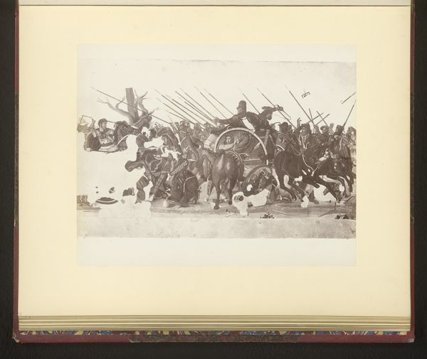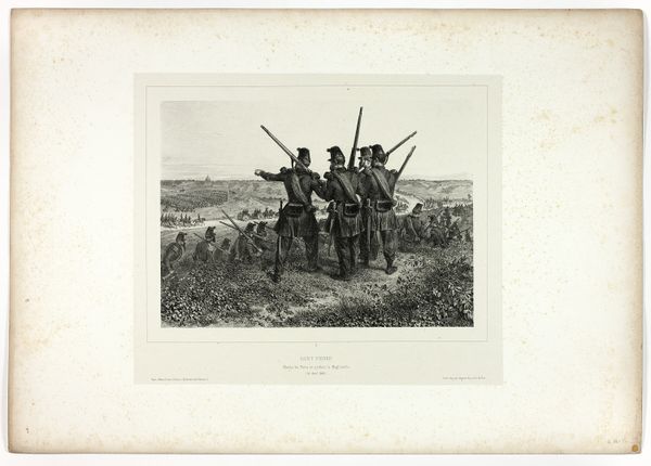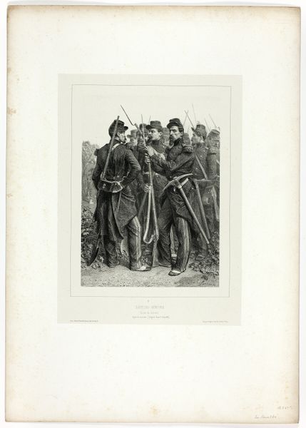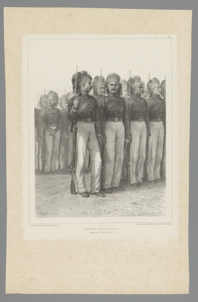 Editor: So, this is "Ready to leave for the Eternal City, from Souvenirs d’Italie: Expédition de Rome" by Auguste Raffet, created around 1850. It's a lithograph printed on paper. It feels very much like a military portrait, and there's a strong sense of anticipation in their stance, even though they're just standing still. What do you make of this piece? Curator: Anticipation is a perfect word. For me, it conjures the smell of gunpowder and dust—a Romantically heightened vision of soldiery. Raffet captures not just their appearance, but an atmosphere... something gritty and determined. Have you noticed how each figure, though part of a line, feels intensely individual? Editor: Absolutely! They’re uniform but all so distinct in their facial expressions and the way they hold themselves. Is that a common element in military depictions of this time? Curator: It’s a beautiful tension, isn’t it? Military art often veers between idealizing the collective strength and acknowledging the individual's role. Raffet, though clearly admiring, hints at the psychological weight of their mission, perhaps? It also taps into the French fascination of the Romantic era with strong, decisive leaders—a longing that, admittedly, can be a bit suspect. Editor: That makes sense. It is very easy to romanticize soldiers and battles. Curator: Indeed. And I suspect Raffet, knowingly or not, played into that a little. But it’s the texture, the line work that elevates this piece for me. Look at the almost frenetic energy of the shading, the contrast with the figures and plain background… what feeling does this bring up for you? Editor: I see the contrast between the smooth paper and the depth Raffet created with all the dark lines. I like the details. It is also a lesson in subtlety. I hadn't really picked up on how well he balanced everything until now! Curator: Me neither. The experience shows you new layers to admire each time, doesn’t it?
