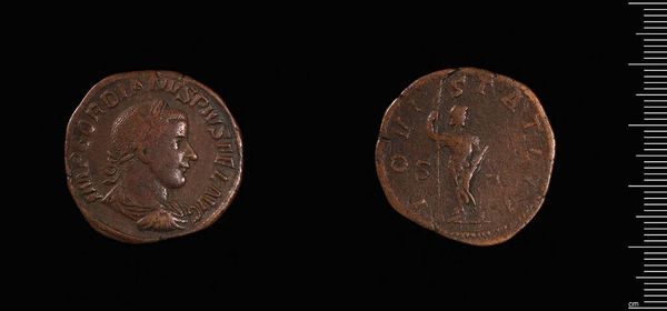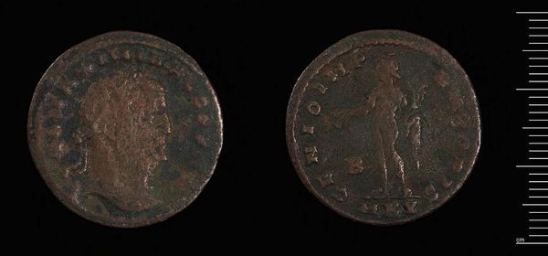 Curator: This is a follis coin from Alexandria, minted under Maximinus II. Look closely at its weight, just 7.41 grams. Editor: It looks small, but weighty with history. The patina is also quite lovely, a testament to its age and journey. Curator: Indeed. Notice how the portrait is rendered—the crisp lines and the use of implied texture to convey imperial power. Editor: The coin's imagery served as propaganda, intended to bolster the emperor’s legitimacy and project an image of strength during a turbulent period. Curator: Exactly. The semiotics of the imagery—the figure on the reverse and the emperor's profile—speak volumes about the intended message. Editor: It makes me wonder about the artisan's personal politics and how they felt about producing imagery for the emperor. Curator: A fascinating thought. Considering the visual language of the piece and its historical role allows us to understand the emperor's perception of his image. Editor: Ultimately, this coin represents more than just currency; it is a symbol of power and the culture that produced it.