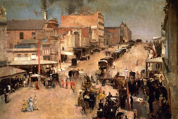 Nicolae Darascu captured Elisabeth Avenue after a rain shower in this watercolor painting. The artist uses a muted palette, dominated by greys and browns, which evokes a feeling of dampness and quietude. The composition is structured around the converging lines of the street and tram tracks, pulling the viewer's eye into the distance. Darascu’s brushstrokes are loose and fluid, reflecting the wet, reflective surfaces of the street and the soft, diffused light after the rain. The artist's technique of layering thin washes of color creates depth and atmospheric perspective. The buildings and figures are rendered with a sense of immediacy, yet their forms remain somewhat indistinct, adding to the painting's overall mood. The artwork operates as a semiotic system, where the wet street and subdued colors signify a specific emotional state and atmospheric condition. Ultimately, the formal qualities of Darascu's work, particularly his use of color and light, reflect a concern with capturing the transient effects of nature, engaging with broader artistic concerns.