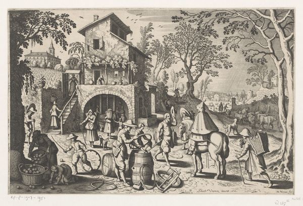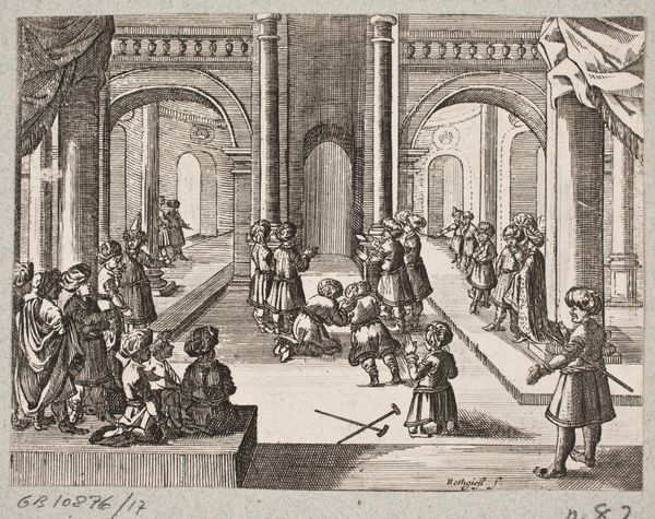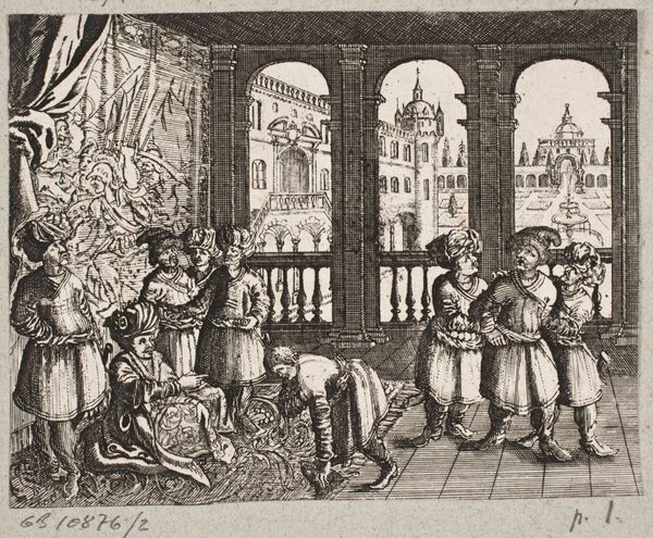 Editor: Here we have a 17th-century engraving by J. Muller, illustrating Adam Olearius’s book on Persia. It’s incredibly detailed for its size, a real peek into how Europeans imagined the East. What first strikes me is the contrast between the lively figures and the almost dreamlike cityscape in the background. What do you see in this piece? Curator: Immediately, I'm drawn to the symbolic weight embedded in the architecture and costuming. Look at the figures bestowing the crown; this simple act is heavy with the memory of empires, the cyclical rise and fall represented visually through architectural symbols. Do you notice how the artist has rendered the figures? Editor: I see the sharp lines emphasizing their clothes and faces, they almost seem like caricatures. Curator: Exactly! That’s no accident. The artist likely aimed to convey a particular interpretation, possibly colored by then-contemporary European perceptions and stereotypes. How does the background, the depiction of the "Persian" city, influence your understanding? Editor: The cityscape, while detailed, feels a little fantastical, not quite real. Maybe that's intentional, feeding into those stereotypes. Curator: Precisely! It serves as a visual shorthand, activating a cultural memory, whether accurate or skewed, in the viewer’s mind. Notice the archway to the left too, mirroring the arc of the figures’ arms and the implied reach of their culture's power, connecting and containing. It seems that it could convey transition but also control of trade and access routes, which also becomes apparent due to the character with a cane seeming to guide a smaller group of figures. This engraving becomes a study in power, both visual and cultural. Editor: I see it now – the details, the composition, even the technique itself contribute to how this image communicated ideas about power and otherness. Curator: Indeed. It's amazing to recognize how an illustration that seems merely descriptive is, in fact, such a complex articulation of cultural ideas and assumptions.