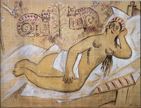 Vudon Baklytsky made this painting, entitled "Sample", in 1986, using oil paints on canvas. Look closely at the paint strokes, and you will notice the ways in which the artist has built up texture through layering. Baklytsky has a distinctive approach to representing the human figure, but here, the material qualities of paint are very much part of the image. Consider the difference between the skin, the sky, and the bottle in her hand – each rendered with a different rhythm and density of application. The flat bold colors, combined with the very visible brushstrokes, create an immediacy that aligns the work with Post-Impressionism. By attending to the surface of this canvas, we might see “Sample” not just as a representation, but as a record of Baklytsky's physical interaction with his chosen medium. This reminds us that the history of art is also the history of skilled work, and thoughtful material application.