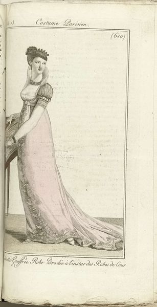 Horace Vernet made this print, “Robe et Manteau de Cour,” in France in 1805, showing a courtly fashion from the Journal des Dames et des Modes. Fashion plates were a powerful medium for circulating ideas about style and social status in the early 19th century. Publications like the Journal became key institutions in shaping taste and dictating the visual codes of elite identity. This image presents a woman in an elaborate court dress, complete with a feathered headdress and long train. The high-waisted silhouette reflects the influence of classical aesthetics on contemporary fashion, a visual trend linked to broader cultural shifts. To fully understand this print, we might look at the history of French fashion, the rise of consumer culture, and the role of the fashion press. We can then consider how the image both reflected and shaped the social norms and aspirations of its time. The visual and material culture of this time and its impact on the making of art is something worth researching.